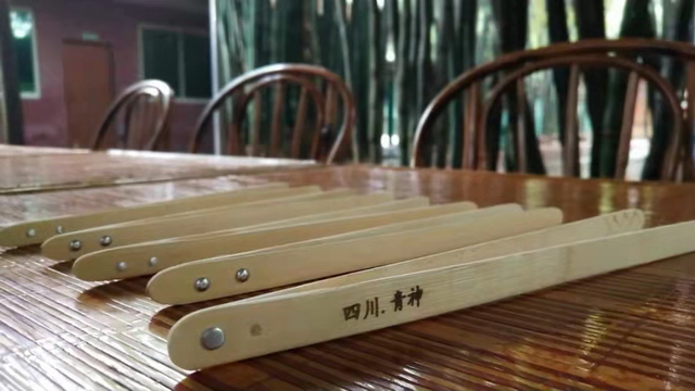眉山市青神县结合竹文化特色,推出了“竹制分菜夹”文创产品,推动文明餐桌行动。