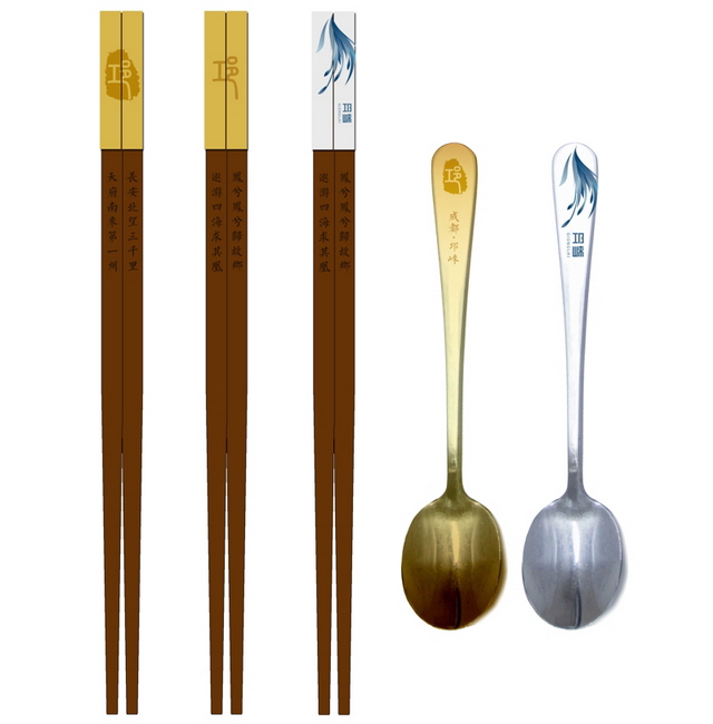 “文创公筷”是邛崃市结合临邛古城文化、“凤求凰”文化,设计制作独具地方文化特色的文创餐具,以“邛”字代表临邛古城文化,以“凤求凰”logo代表邛崃文君文化,并在餐具上配以描绘邛崃的古诗联对、辞赋佳句等。