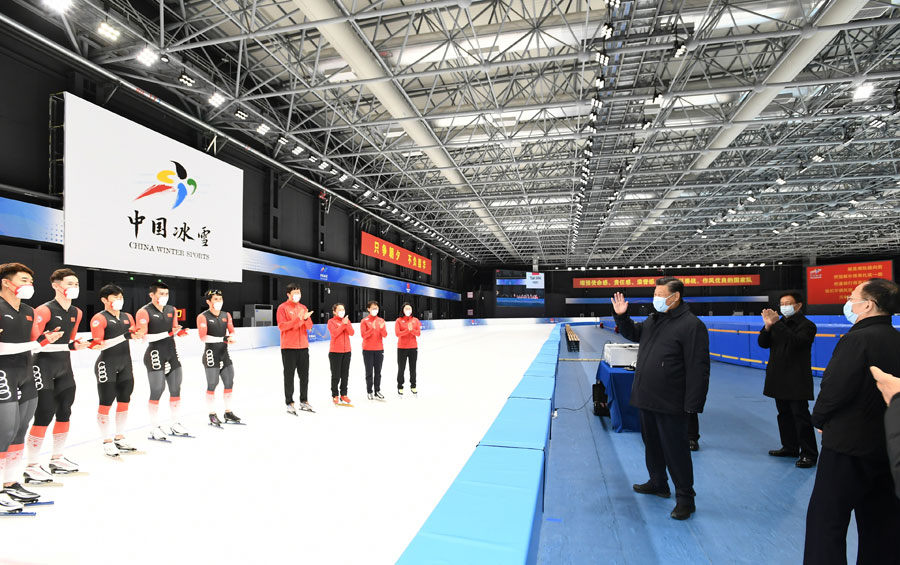 1月4日,中共中央总书记、国家主席、中央军委主席习近平在北京考察2022年冬奥会、冬残奥会筹办备赛工作。这是4日下午,习近平在二七厂冰雪项目训练基地速滑馆,向参训运动员、教练员表示慰问。新华社记者 谢环驰 摄