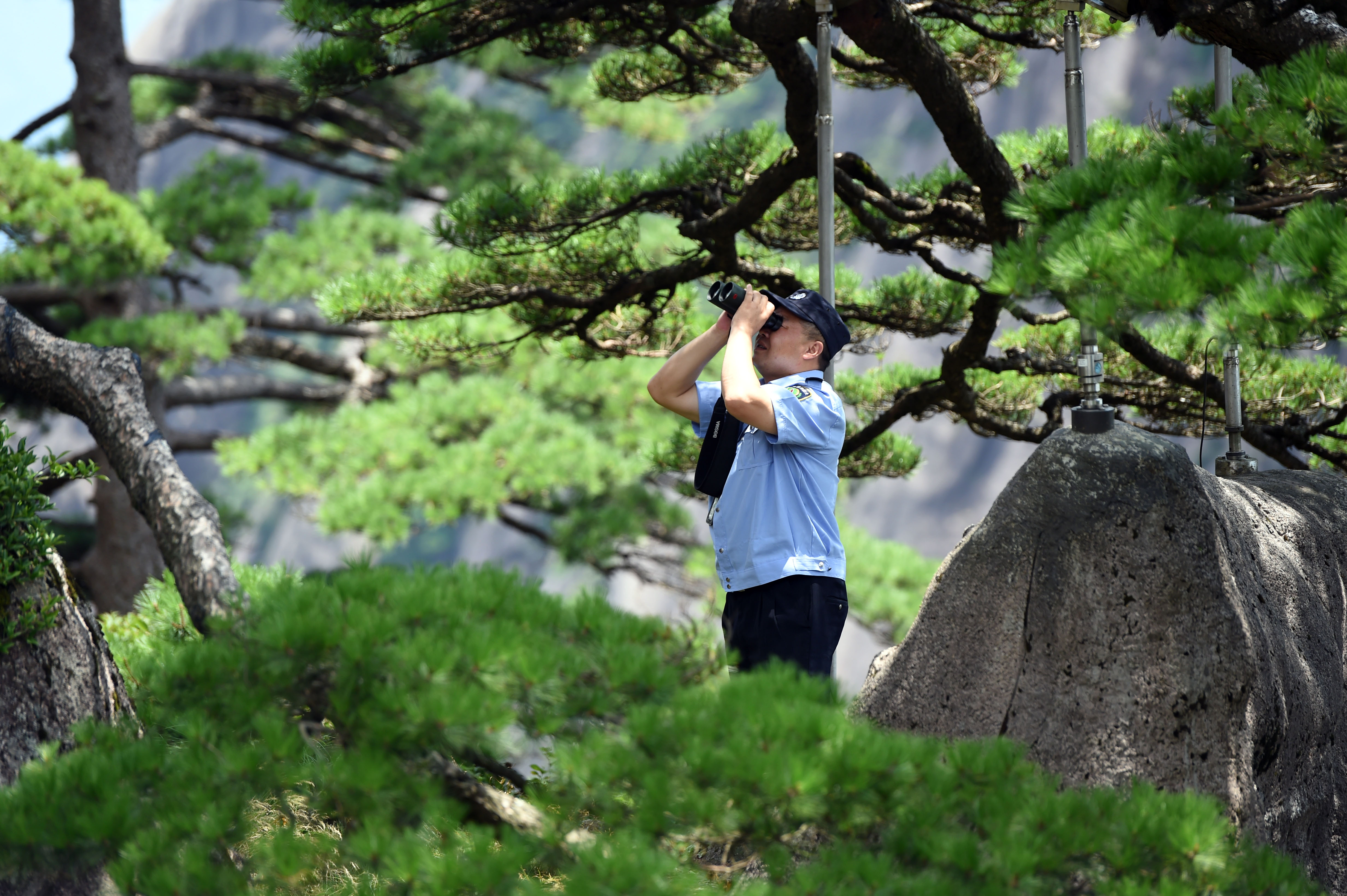 安徽黄山守松人胡晓春在例行巡查中用望远镜查看迎客松情况(2022年8月14日摄)。新华社记者 周牧 摄