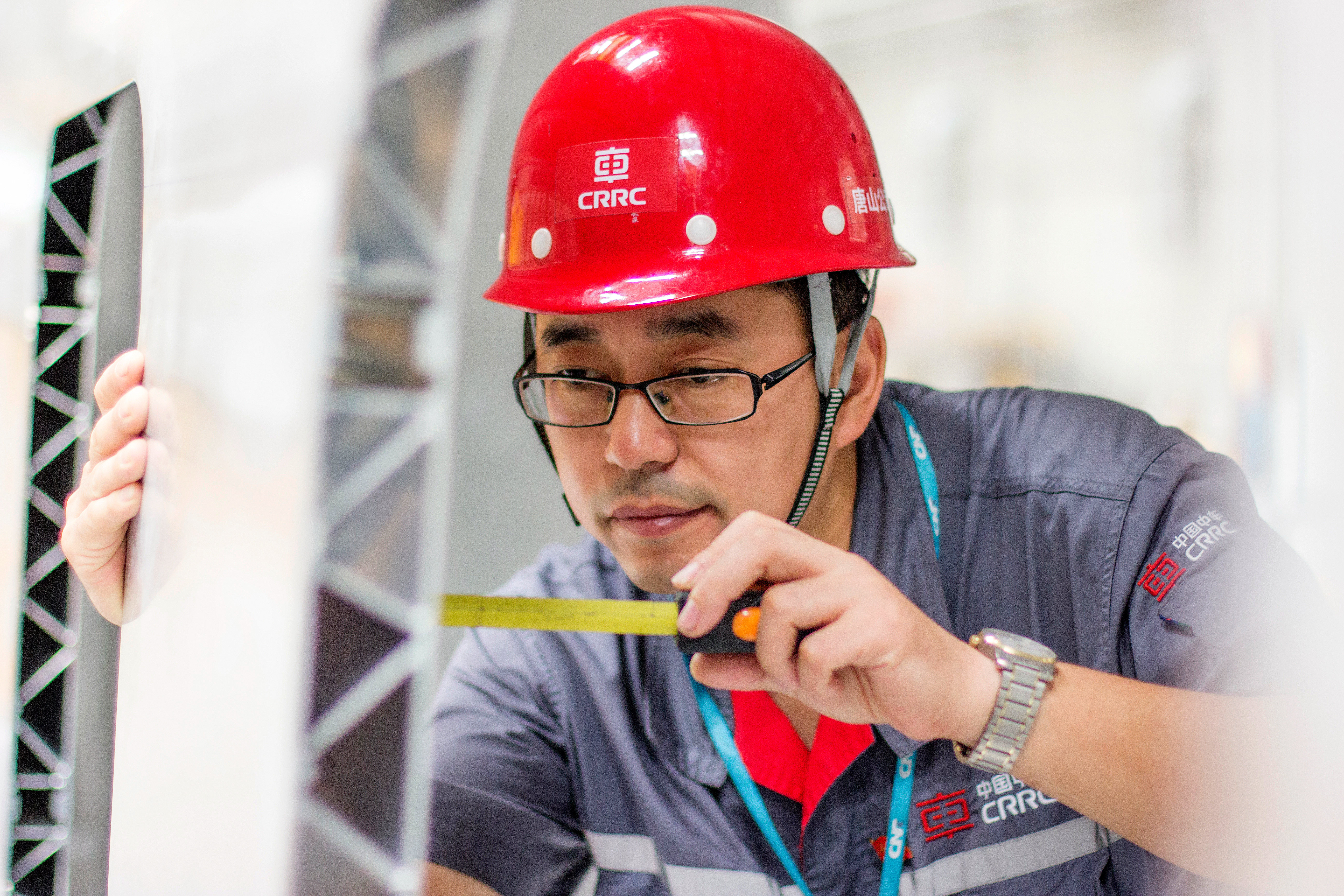 中国中车唐山机车车辆有限公司车体事业部高级技师张雪松在车体总成工序检查尺寸(2016年7月摄,资料照片)。新华社发 王卫平 摄
