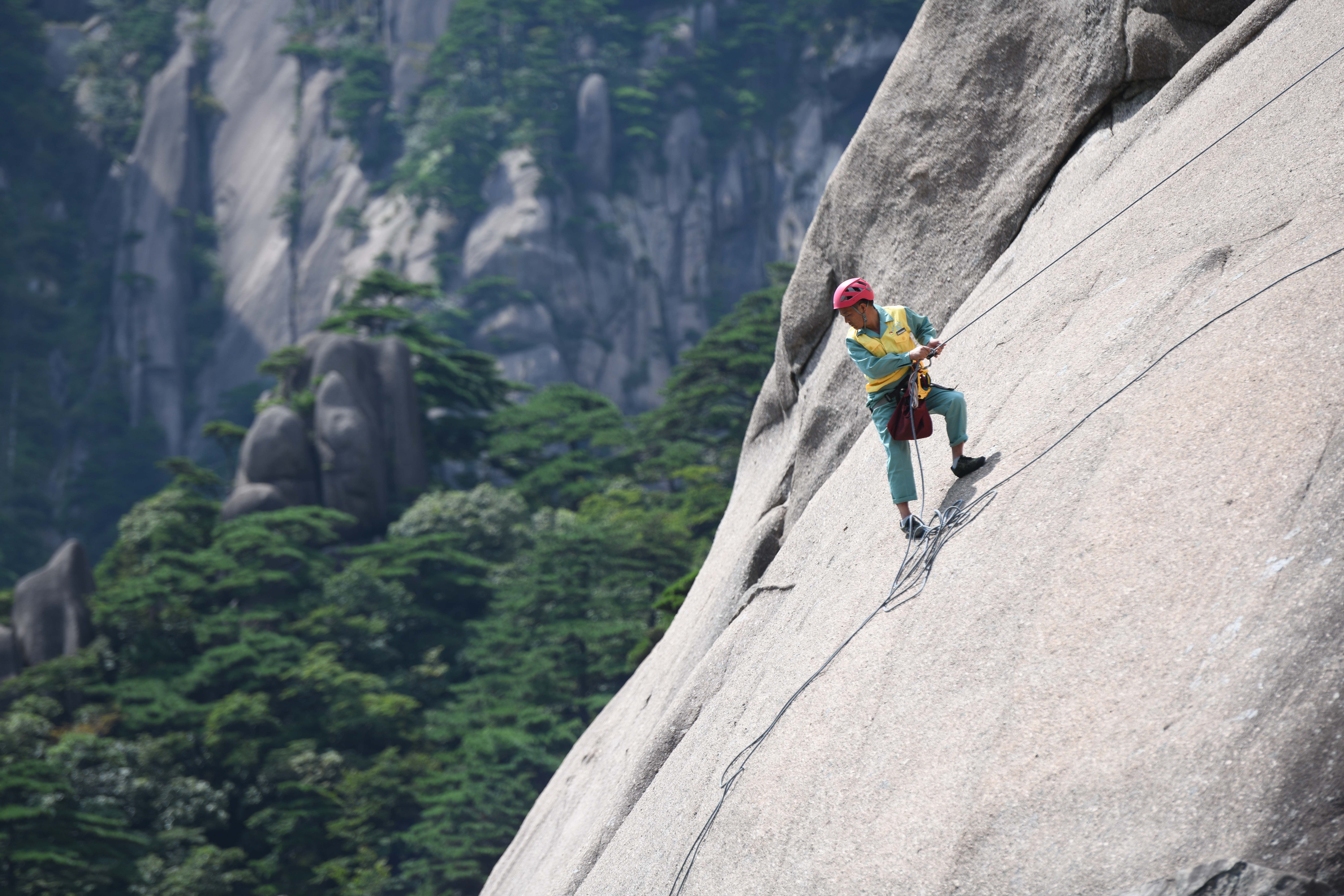 紧了紧身上的绳扣,扶了扶头顶的安全帽,李培生往崖下又望了望,而后拽着安全绳缓缓把自己放了下去……冬日的黄山,依然有不少游客,但人们不太注意这位皮肤黝黑的汉子。