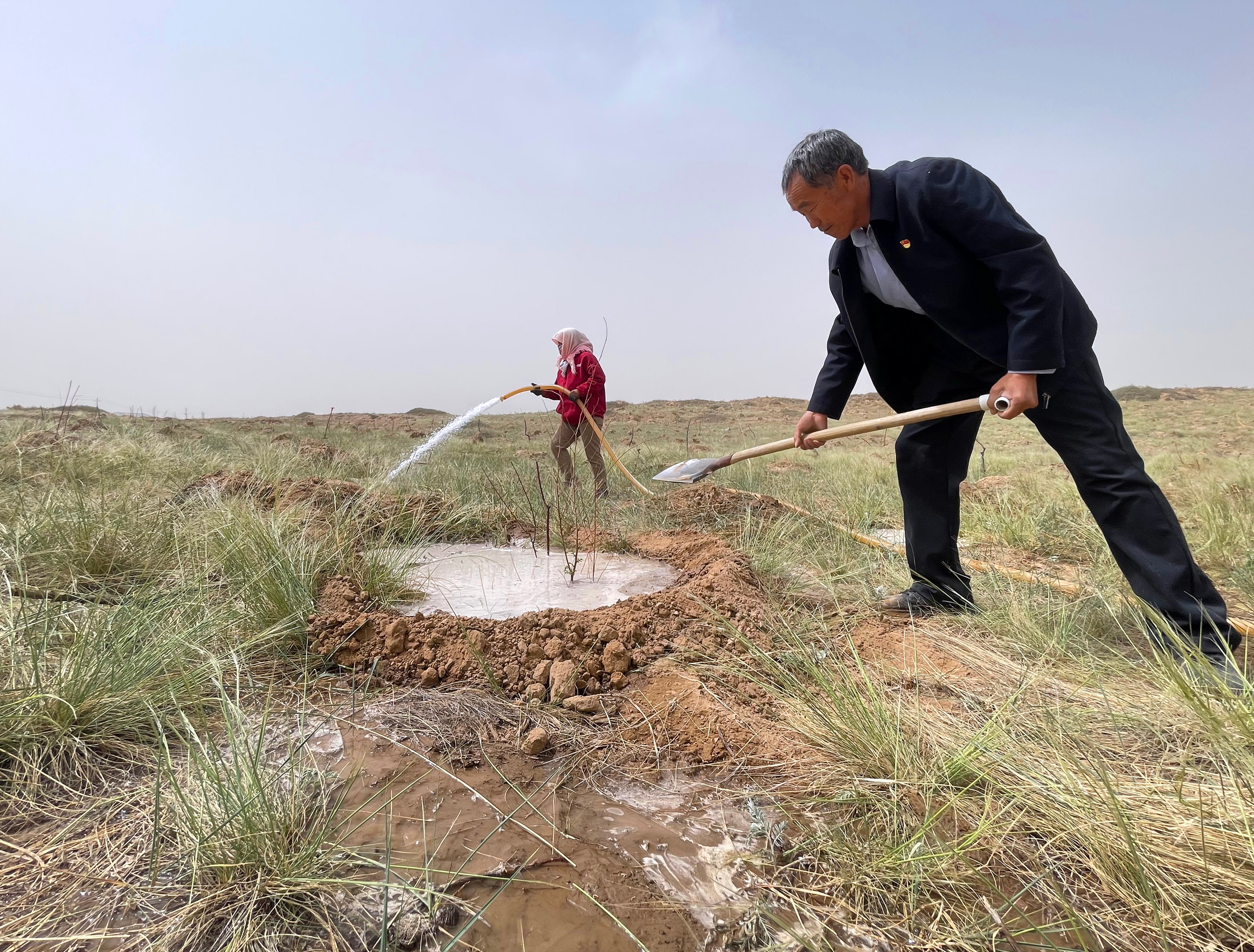 在甘肃省武威市古浪县八步沙林场,场长郭万刚(右)与林场职工为新种树苗浇水(2022年5月6日摄)。新华社记者 郭刚 摄