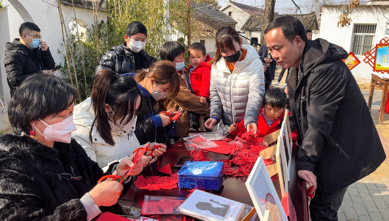 汪桥村的村民们围观欣赏非遗文化庐阳剪纸。