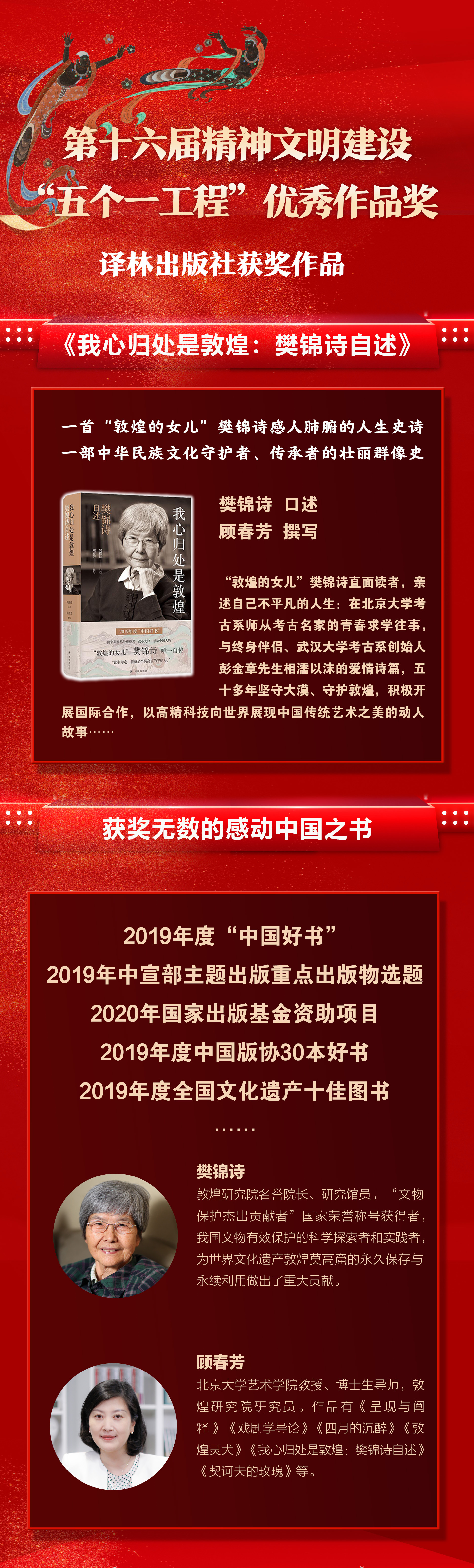 本书是“文物保护杰出贡献者”国家荣誉称号获得者樊锦诗的自传。在这本自述中,樊锦诗娓娓道来,带领读者领略了敦煌石窟壁画的精美绝伦,解读了敦煌文化的博大精深,向大家讲述了莫高窟人面对残破不堪的洞窟的担当有为,以及敦煌文物考古和研究过程中发生的诸多感人至深的故事。(供稿:中宣部文艺局)