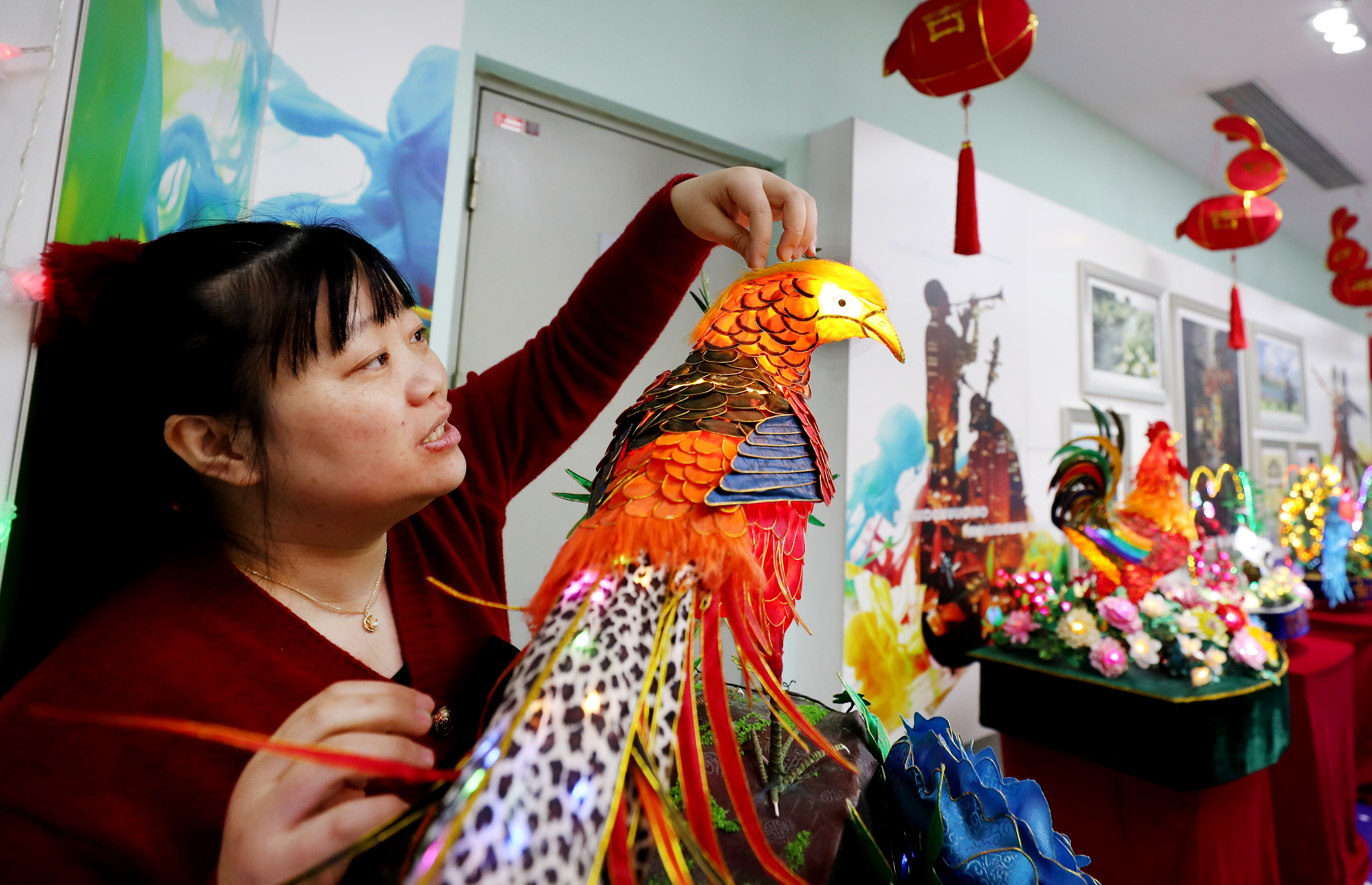 2月1日,龚智瑜整理“红腹锦鸡”造型灯彩。新华社记者 方喆 摄