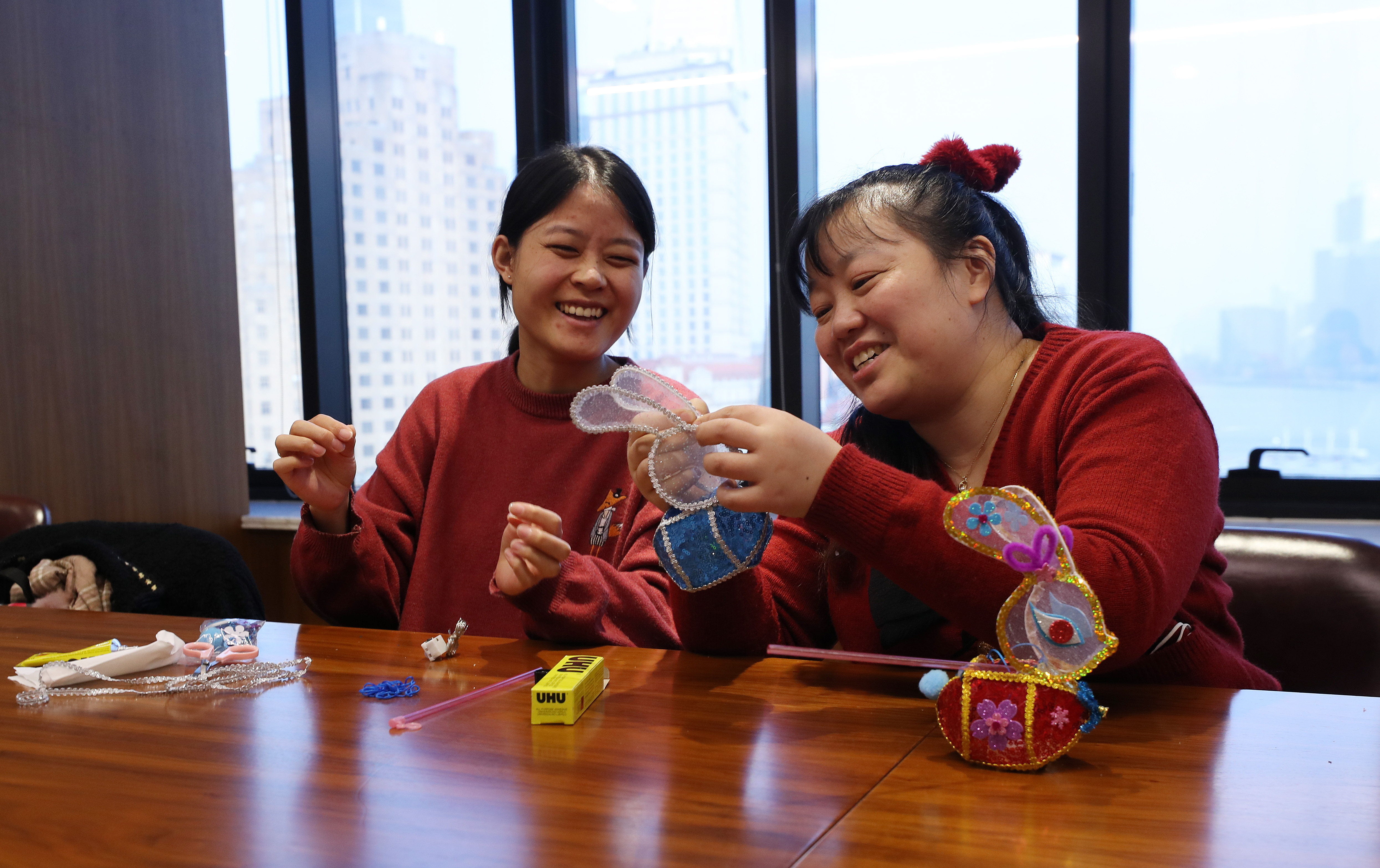 2月1日,龚智瑜(右)在上海外滩街道为社区企业职员讲解兔子灯制作技法。新华社记者 方喆 摄