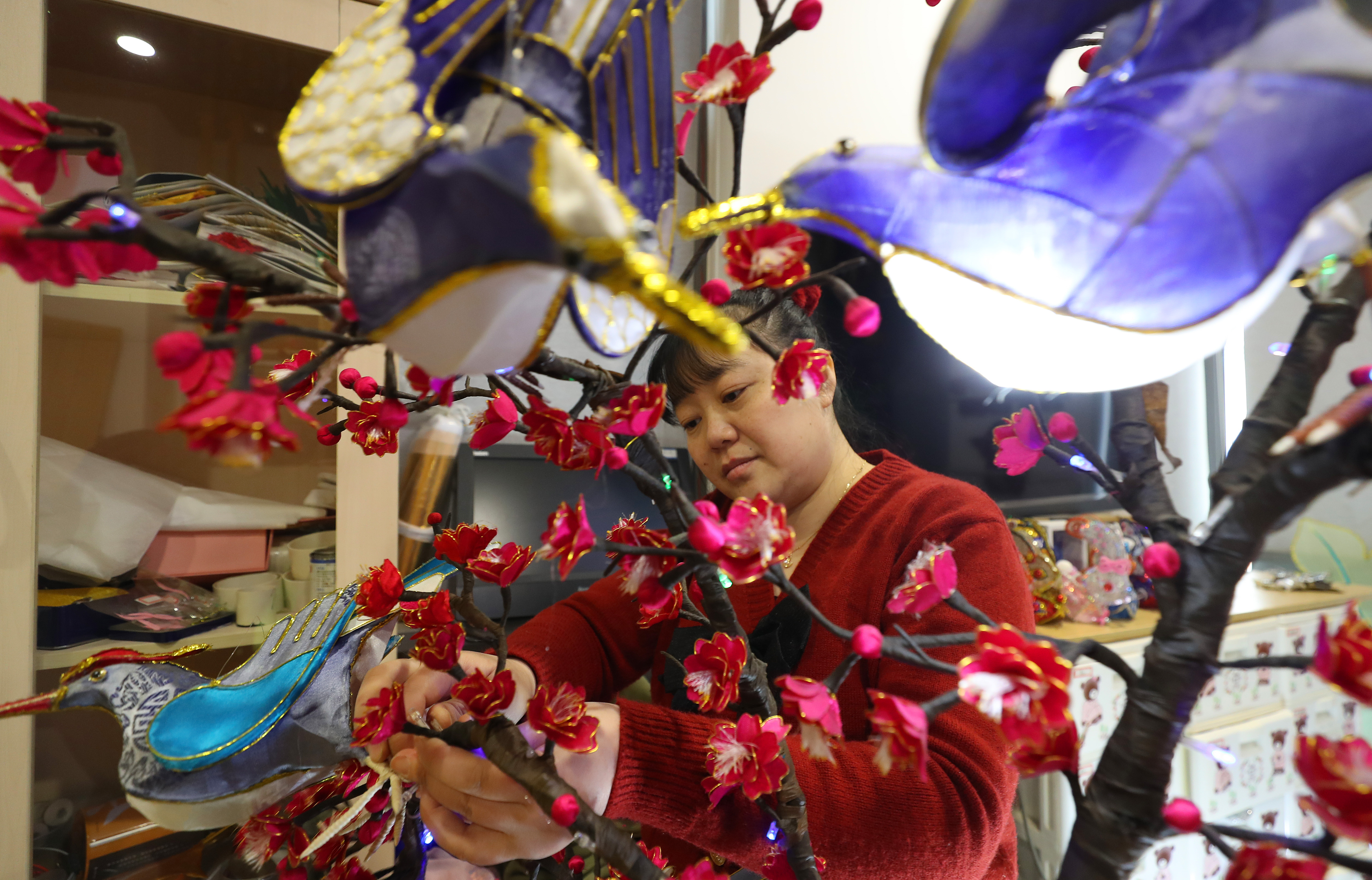 元宵佳节前夕,“上海灯彩”制作技艺黄浦区代表性传承人龚智瑜和工作室的同事忙于元宵灯彩的展示布置工作。今年元宵节,工作室几十盏灯彩将为申城元宵佳节增光添彩。“上海灯彩”以精致细腻的立体动植物为特色,从花瓣花蕊到鸟的羽毛、鱼的鳞片都灵动逼真。