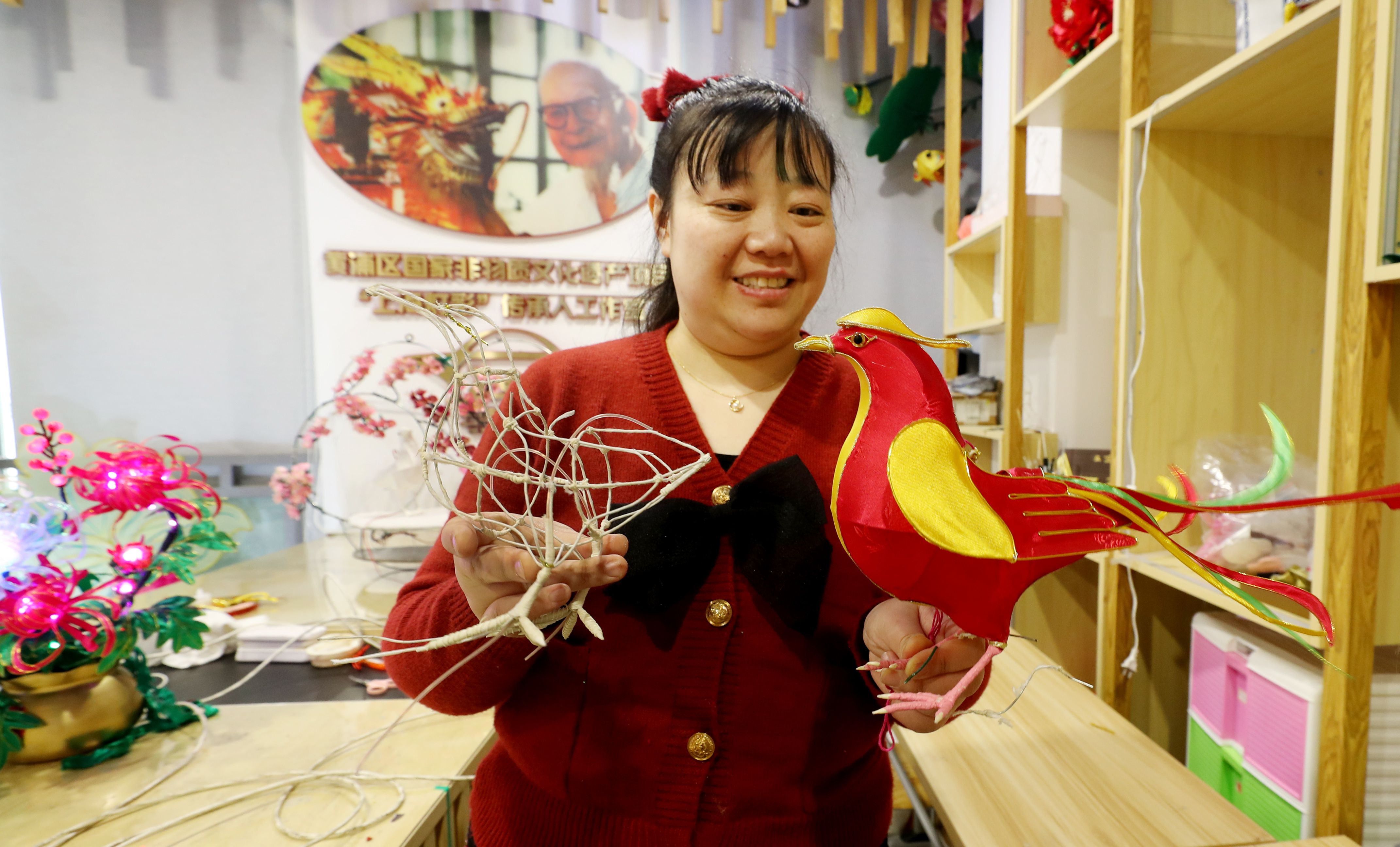 2月1日,龚智瑜展示鸟类灯彩的骨架和裱糊成品。新华社记者 方喆 摄
