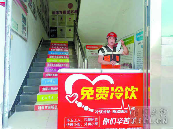 近日,莲城志愿者协会在岳塘区岚霞路莲香华庭门口设置了一台爱心冰柜,为高温天气依然奔走在户外的劳动者送关爱。冰柜外醒目地写着“免费冷饮”“环卫工人、民警同志、快递小哥、外卖小哥,你们辛苦了!”等,里面则放置了一些瓶装矿泉水。不少市民表示,小小冰柜,不仅是能量的补给站,也是文明的示范站。图为环卫工人从爱心冰柜取拿矿泉水。(英国365bet体育在线_36563688_国内365bet登录网址日报社全媒体记者 杨阳 摄影报道)